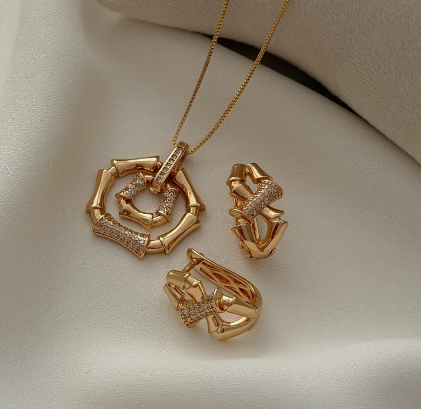 ویژگی های محصول برند:دریم رنگ:طلایی با آبکاری طلا 18 ارتفاع پلاک:2.4 سانت ارتفاع گوشواره:1.8 سانت زنجیر:ندارد