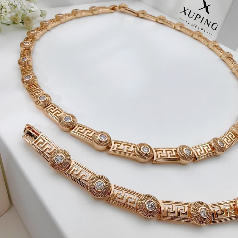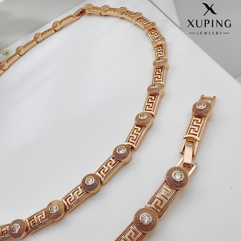 ویژگی های محصول برند:ژوپینگ رنگ:طلایی با آبکاری طلا 18 ضخامت:6 میل طول دستبند:18 با 2 سانت تکه اضافه طول گردنبند:44 سانت