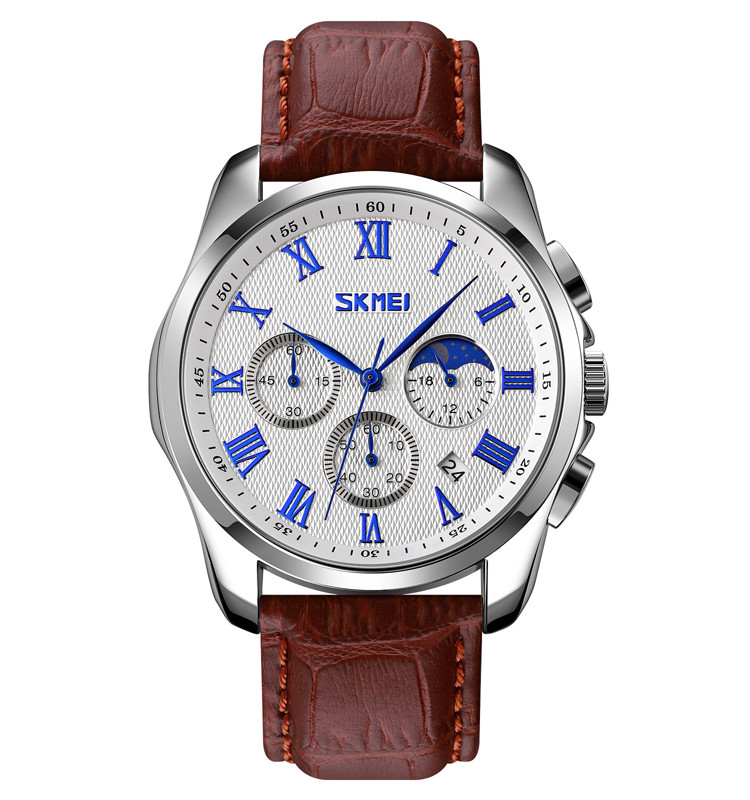 ساعت اسکمی 9260 با طراحی مدرن و مینیمالیستی خود، ظاهری شیک و جذاب دارد. این ساعت با بند چرمی قهوه ای یا مشکی و قاب نقره ای آبی، به هر استایلی مناسب است.